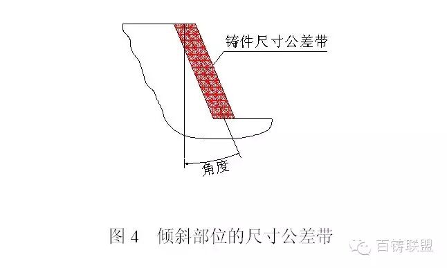 当铸件有倾斜的部位,其尺寸公差应沿倾斜面对称标注(见图4)。公差值按铸件基本尺寸从表1中选取。