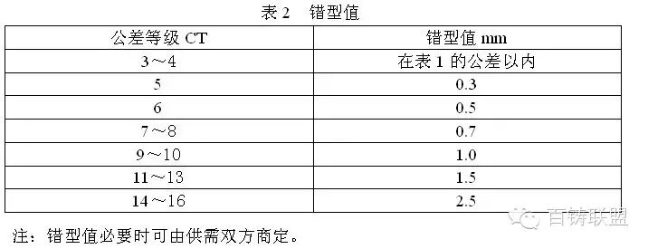 ② CT13至CT16小于或等于16mm的铸件基本尺寸,其公差值需单独标注,可提高2~3级。