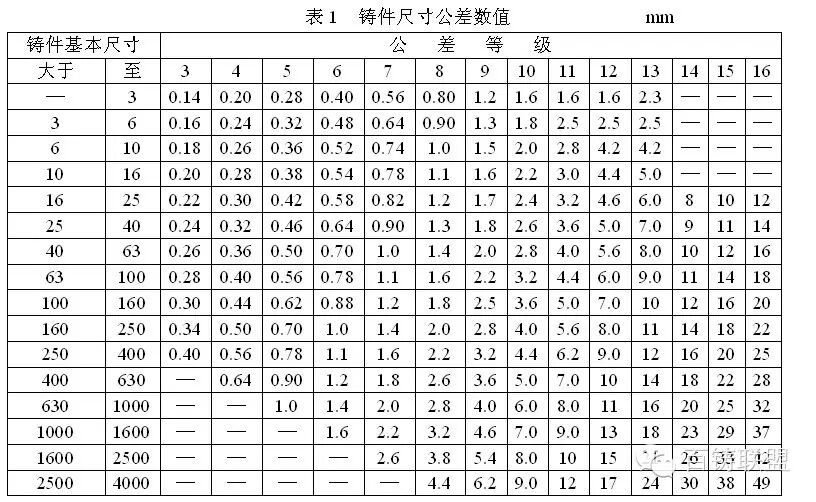 铸件尺寸公差的代号为CT,公差等级分为16级,各级公差数值列于表1.