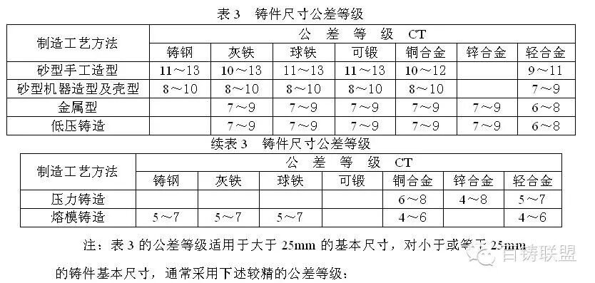 注:表3的公差等级适用于大于25mm的基本尺寸,对小于或等于25mm的铸件基本尺寸,通常采用下述较精的公差等级: